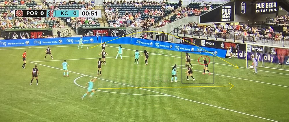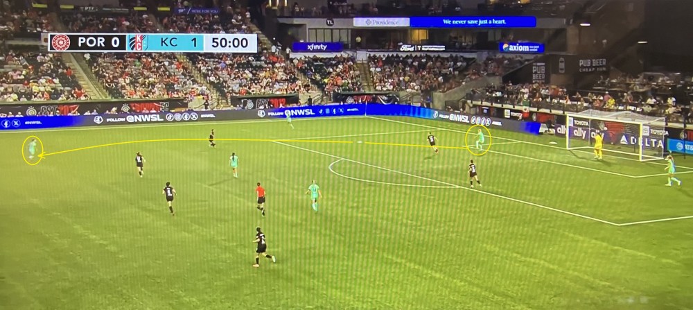 A lot of that was Kansas City; like we’ve said, their defending is the best in the league. But a lot of that is Turner and Moultrie just lack the pace to get open. See Turner in the screenshot above? Yep, that’s Hailie Mace ball-side-goal-side of her and Turner couldn’t get space on her. Moultrie couldn’t. Fleming couldn’t.