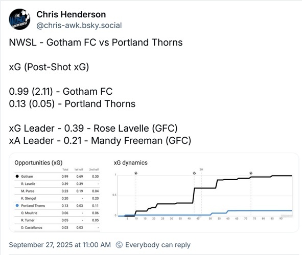 It’s worth adding that when Ken swapped out Obaze for Turner the addition of a vertical threat helped make that little post-halftime burst of blue in the plot above. Not enough, mind, but you could see the difference. But by that time the Thorns were down two and routed.